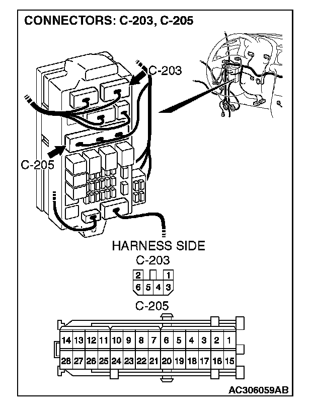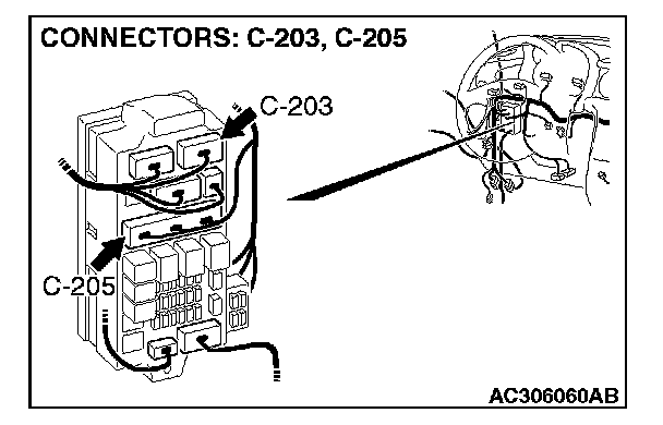 NOTE: Also check junction block connector C-205, C-203 for loose, corroded, or damaged terminals, or terminals pushed back in the connector. If junction block connector C-205, C-203 is damaged, repair or replace it.
