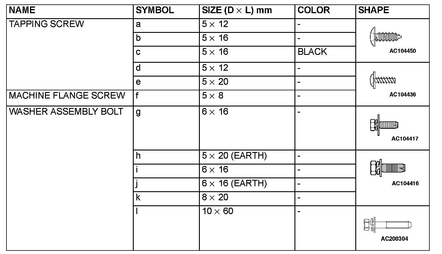 The following bolts and screws are used for installing the instrument panel. Bolts and screws are indicated as marks shown in the illustration in the sections of "Removal and Installation" and "Disassembly and Assembly."