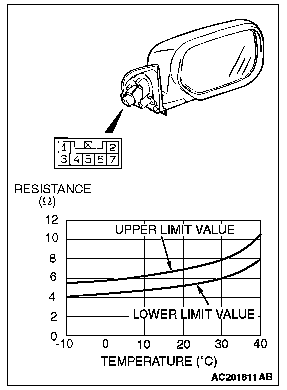 Check to see that the resistance shown in the graph is almost satisfied when measuring the resistance of terminal 1 and 2 of the door mirror connectors under 2 or more different temperature conditions.