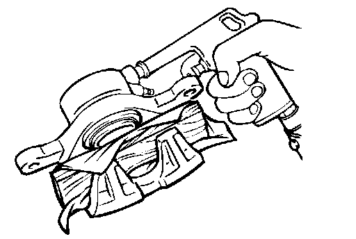 Place a piece of wood, etc. against the caliper body as shown. Blow compressed air through the brake hose to remove the piston boot and piston.
