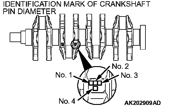 1. Measure the crankshaft pin diameter and confirm its classification from the following table. On a crankshaft supplied as a service part, identification marks of its pins are stamped at the positions shown in the illustration.