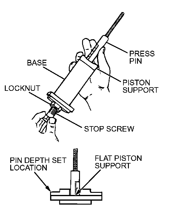 2. Thread the stop screw and lock nut assembly into the base. Fit the correct piston support on top of the base. Insert the press pin, threaded end up, into the hole in the piston support until the press pin touches the stop screw.