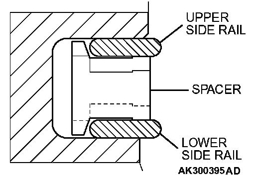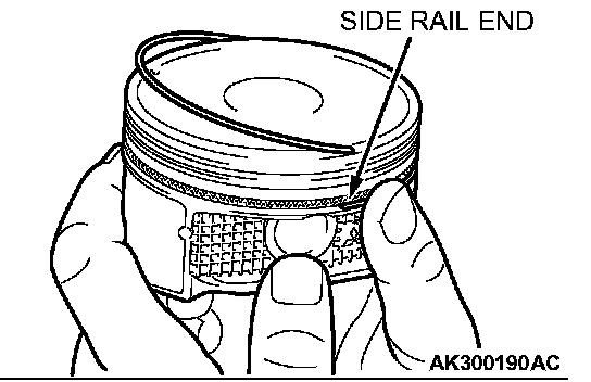To install the side rail, first fit one end of the rail into the piston groove, then press the remaining portion into position by hand. See illustration.