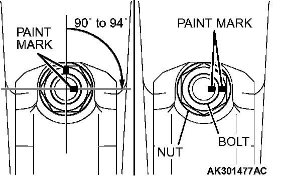 7. Turn the nut 90 to 94 degrees and make sure that the paint marks on the nut and bolt are aligned.