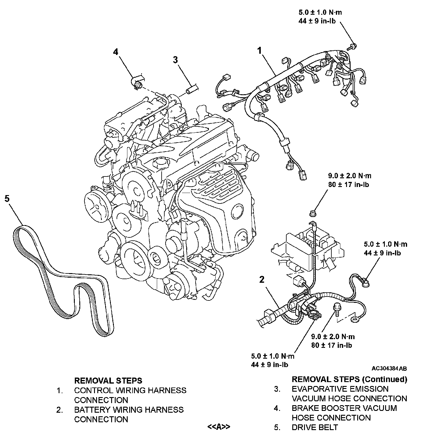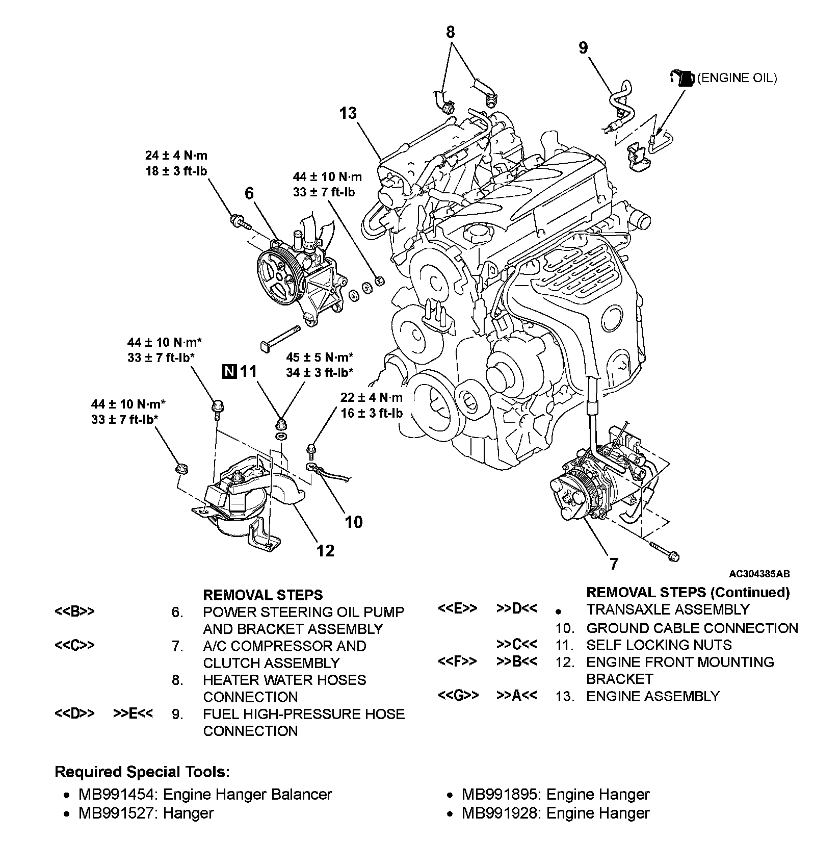 NOTE: After removing the power steering oil pump and bracket assembly, secure it with a cord in the location where the removal and installation of the engine assembly cannot be hindered.