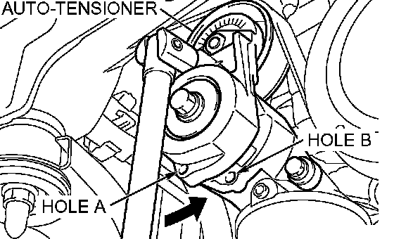 2. Rotate the auto-tensioner counterclockwise and align hole A with hole B.