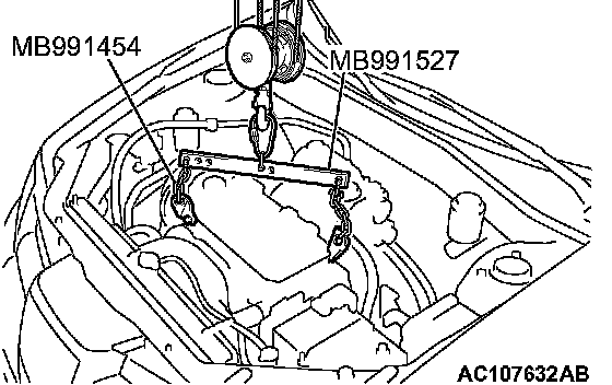 After checking that all cables, hoses and wiring harness connectors and so on are disconnected from the engine, lift the chain block slowly to remove the engine assembly upward from the engine compartment.