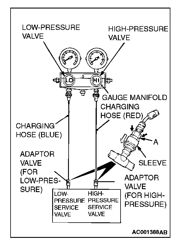 NOTE: The high-pressure service valve is on the liquid pipe A and the low-pressure service valve is on the suction hose.