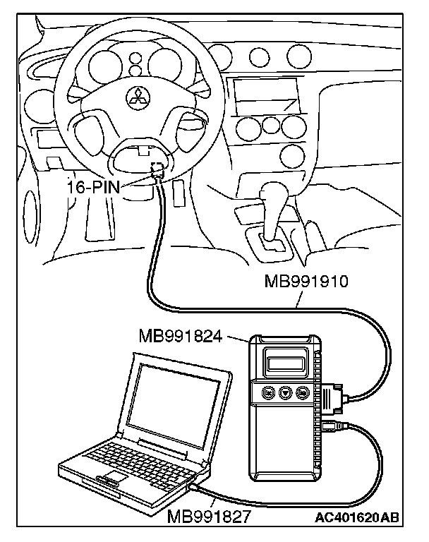 3. Connect special tool MB991827 to special tool MB991824 and the personal computer.