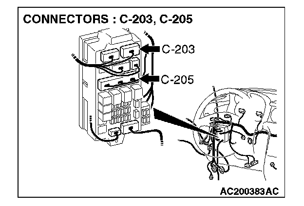 NOTE: Also check junction block connectors C-203 and C-205 for loose, corroded, or damaged terminals, or terminals pushed back in the connector. If junction block connector C-203 or C-205 is damaged, repair or replace the connector as described in Harness Connector Inspection.