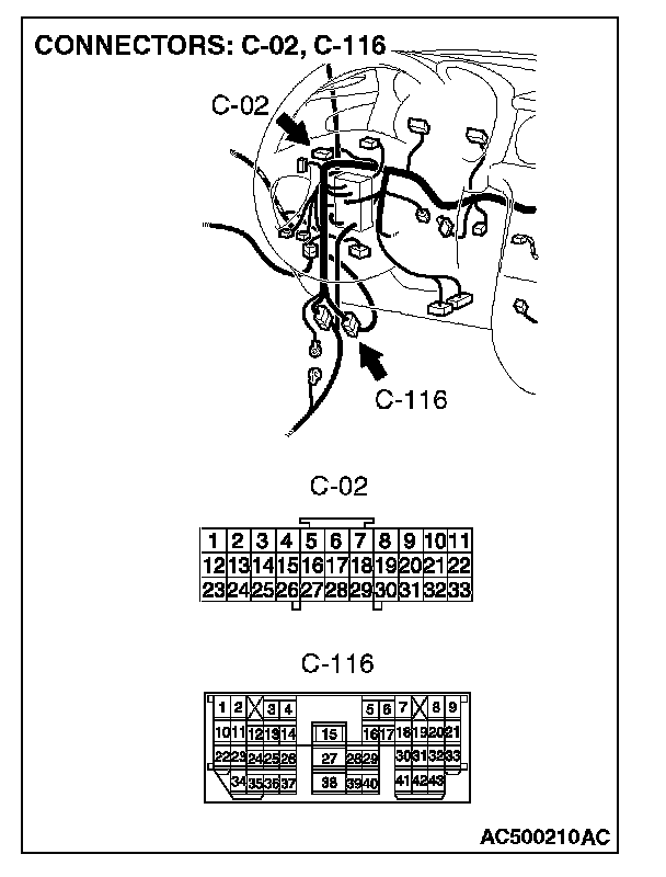 NOTE: Also check joint connector C-02 and intermediate connector C-116 for loose, corroded, or damaged terminals, or terminals pushed back in the connector. If joint connector C-02 or intermediate connector C-116 is damaged, repair or replace the connector as described in Harness Connector Inspection.