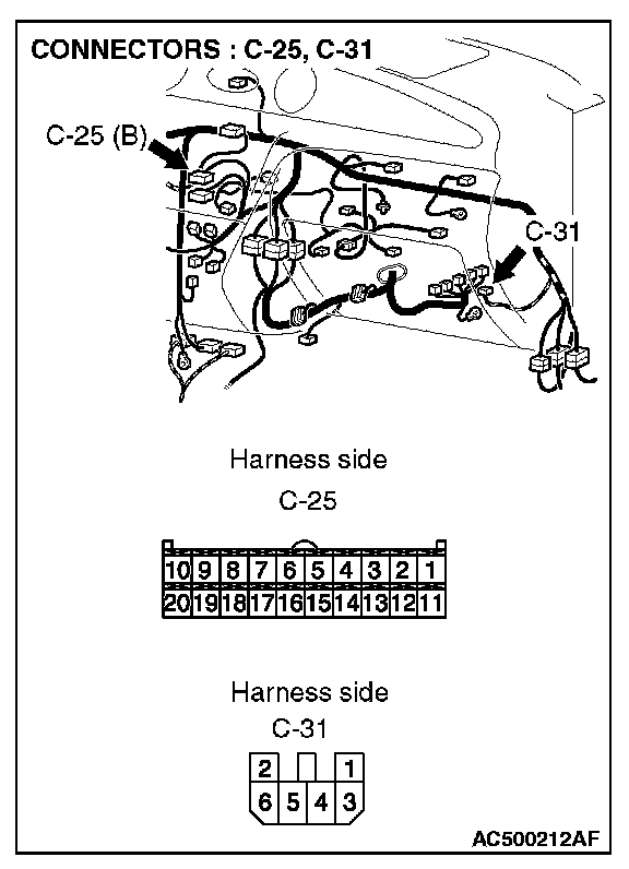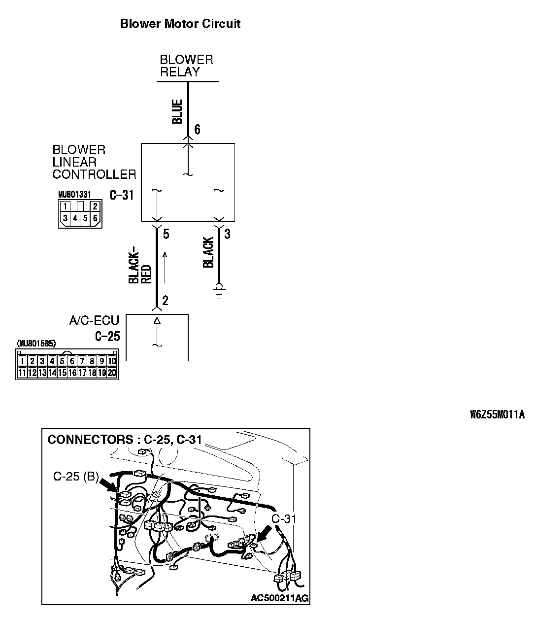 STEP 3. Check the wiring harness between A/C-ECU connector C-25 (terminal 2) and blower linear controller connector C-31 (terminal 5).