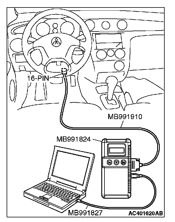 CAUTION: To prevent damage to scan tool MB991958, always turn the ignition switch to the "LOCK" (OFF) position before connecting or disconnecting scan tool MB991958.