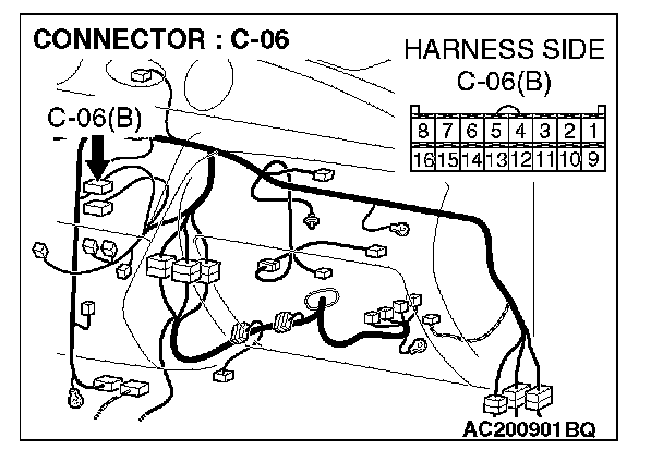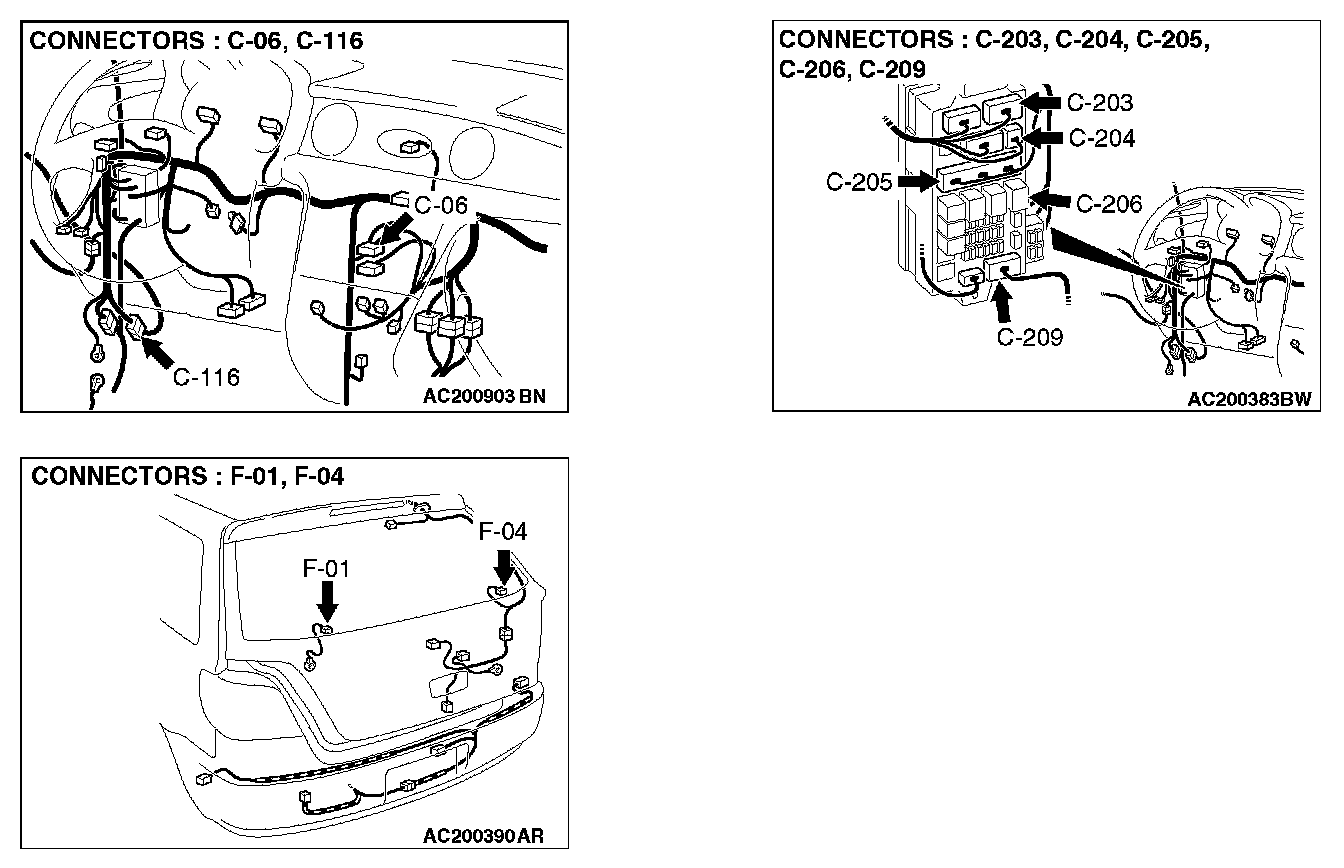 STEP 10. Check rear window defogger relay connector C-206 and A/C-ECU connector C-06 for damage.