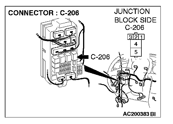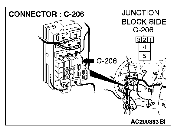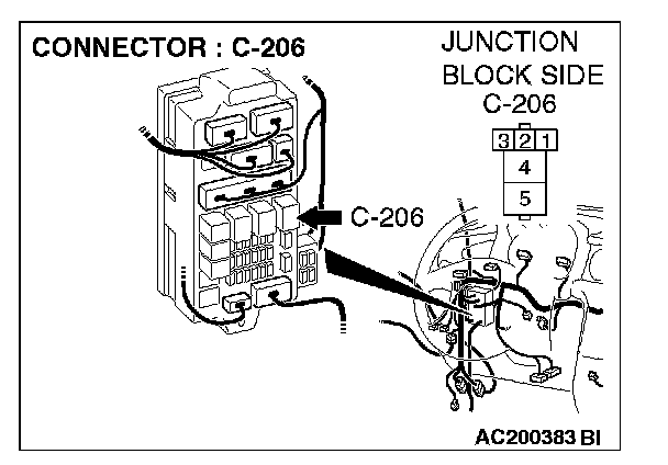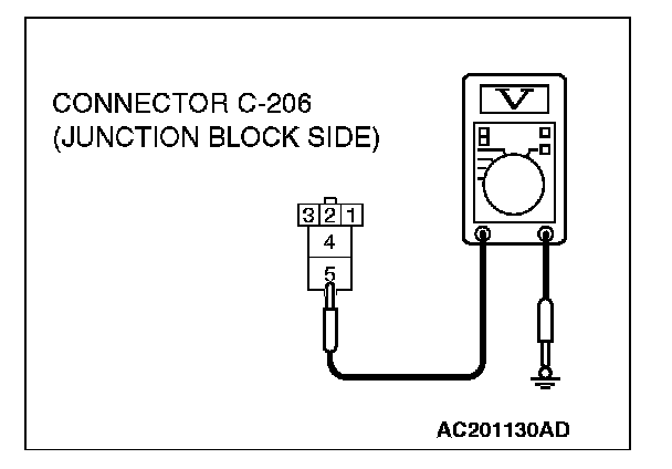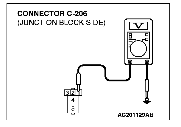 1. Disconnect rear window defogger relay connector C-206, and measure the voltage at the junction block side.
