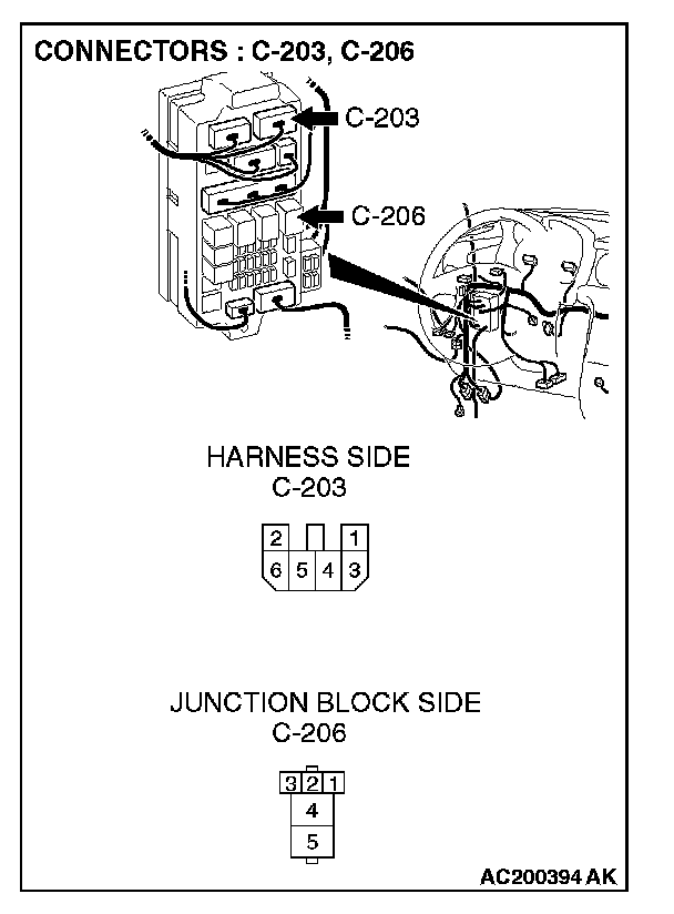 NOTE: Also check junction block connector C-203. If junction block connector C-203 is damaged, repair or replace the connector as described in Harness Connector Inspection.