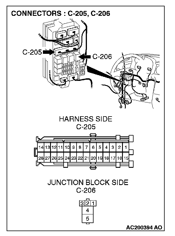 NOTE: Also check junction block connector C-205. If junction block connector C-205 is damaged, repair or replace the connector as described in Harness Connector Inspection.