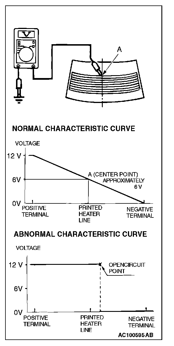2. Turn on the rear window defogger switch, and use a voltmeter to measure the voltage in each printed heater at middle point A on the rear window glass.