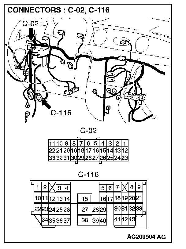 NOTE: Also check intermediate connector C-116 and joint connector 3. C-02. If intermediate connectors C-116 or joint connector 3. C-02 are damaged, repair or replace the connector as described in Harness Connector Inspection.