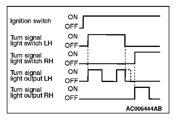 The turn-signal light output (flashing signal) is turned ON when the turn-signal light ignition switch is ON and the turn-signal light switch is ON (LH or RH.) If the front turn-signal light or rear turn-signal light bulb has burned out, the flashing speed increases to indicate that the bulb has burned out.