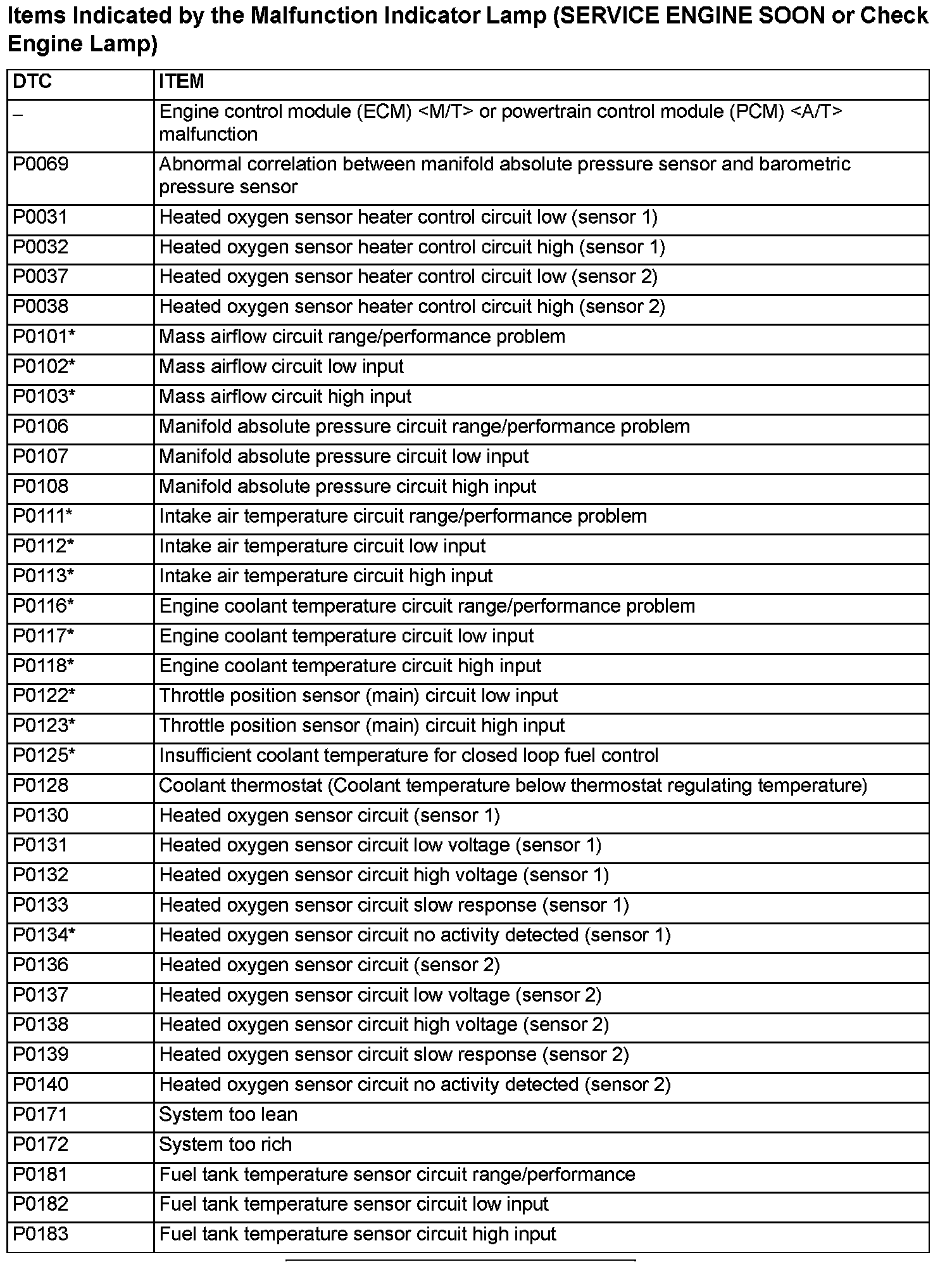 Items Indicated by the Malfunction Indicator Lamp (SERVICE ENGINE SOON)