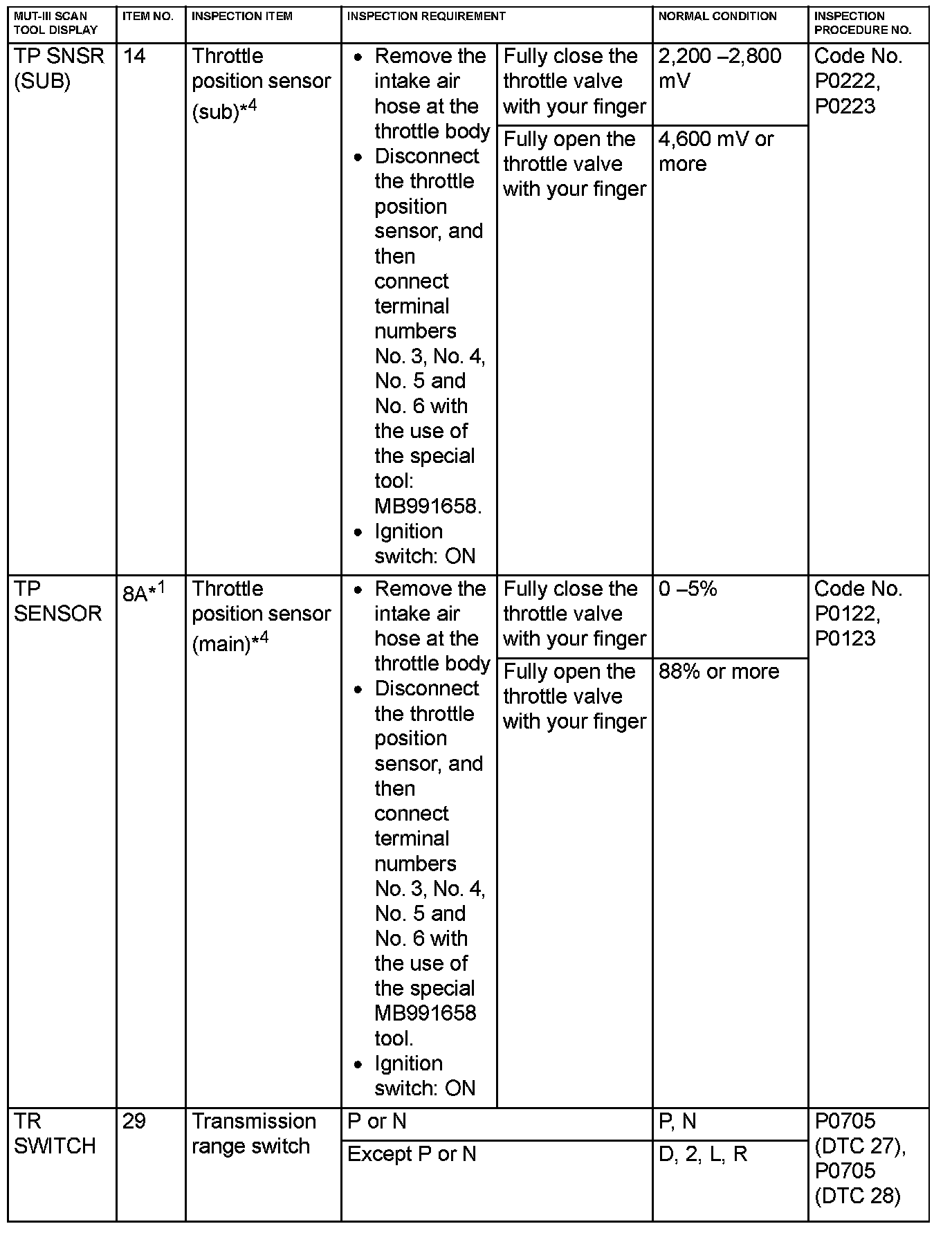 NOTE: *4: After the inspection has been completed, connect the throttle actuator control motor connector, and then use the scan tool MB991958 (MUT-III sub assembly) to delete the diagnosis code that was recorded during the inspection.