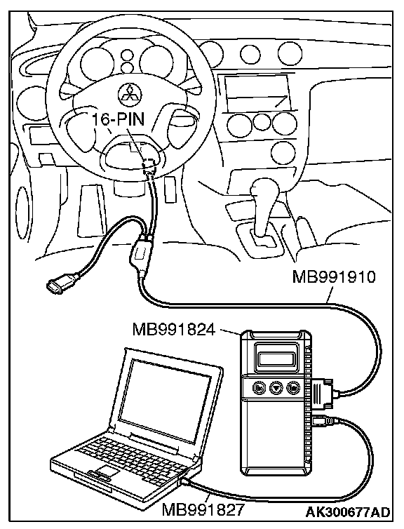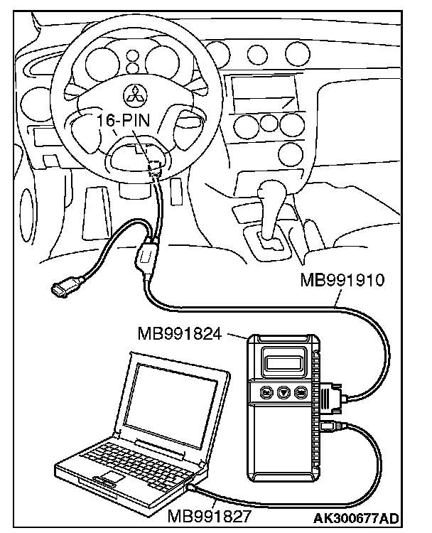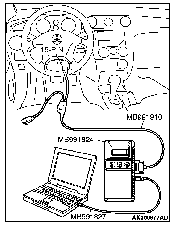 CAUTION: To prevent damage to scan tool MB991958, always turn the ignition switch to the "LOCK" (OFF) position before connecting or disconnecting scan tool MB991958.