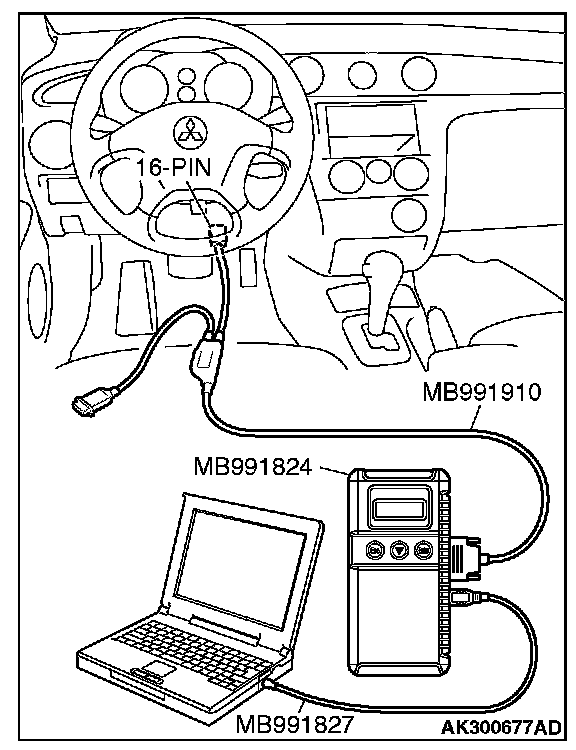 CAUTION: To prevent damage to scan tool MB991958, always turn the ignition switch to the "LOCK" (OFF) position before connecting or disconnecting scan tool MB991958.