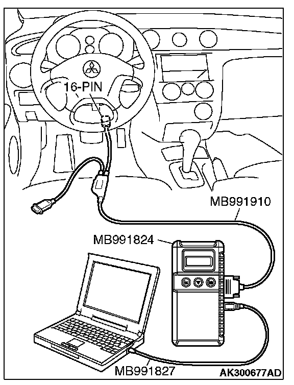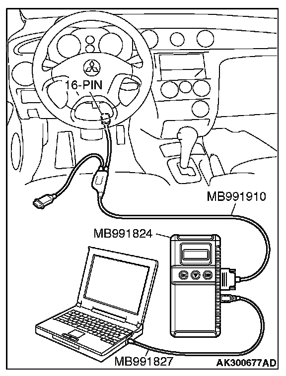 CAUTION: To prevent damage to scan tool MB991958, always turn the ignition switch to the "LOCK" (OFF) position before connecting or disconnecting scan tool MB991958.