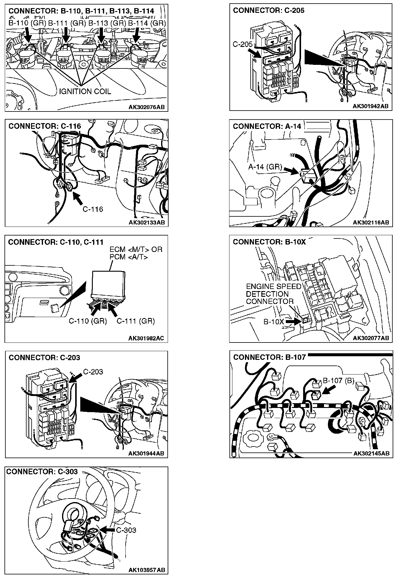 STEP 2. Check harness connector B-110, B-111, B-113 and B-114 at ignition coil for damage.