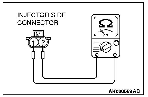 2. Measure the resistance between each injector side connector terminal No. 1 and No. 2.