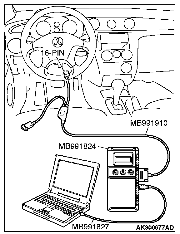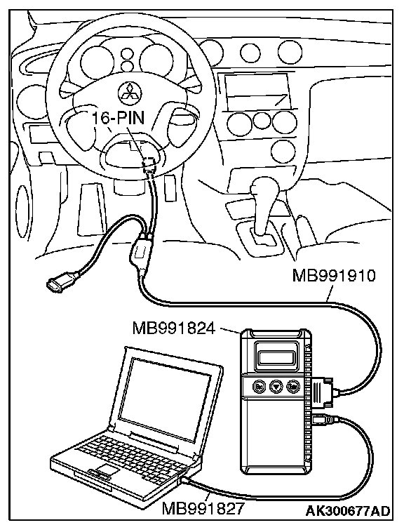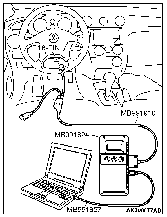 CAUTION: To prevent damage to scan tool MB991958, always turn the ignition switch is to the "LOCK" (OFF) position before connecting or disconnecting scan tool MB991958.