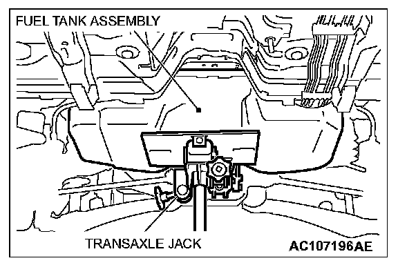 CAUTION: Support the fuel tank assembly securely so that it does not fall off from the transaxle jack.