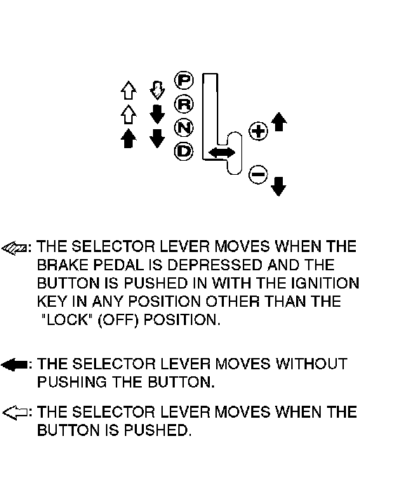 NOTE: The A/T mis-operation prevention mechanism prevents movement of the selector lever from the P position if the ignition switch is in a position other than LOCK (OFF) position and the brake pedal is not depressed.