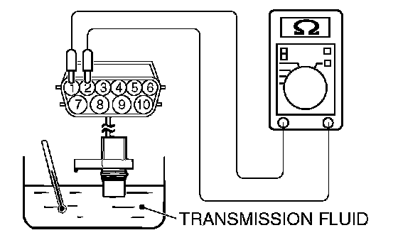 2. Measure the resistance between terminals 1 and 2 of the transmission fluid temperature sensor connector.