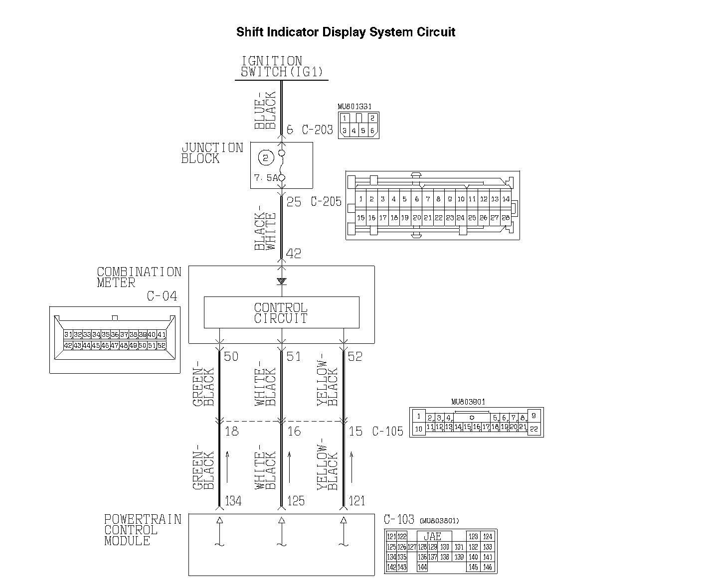 STEP 8. Check the harness for open circuit or short circuit to ground between the combination meter connector C-04 (terminals 50, 51 and 52) and the PCM connector C-103 (terminals 134, 125, 121).