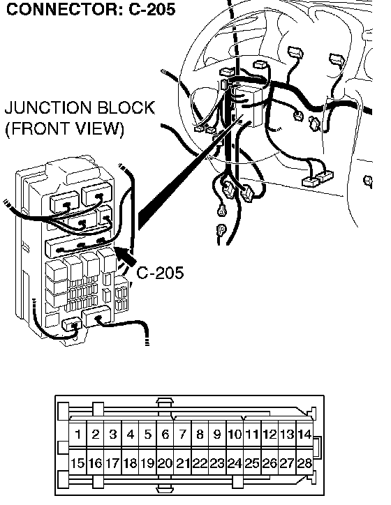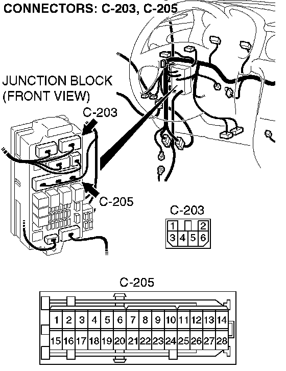STEP 10. Check combination meter connector C-04 and junction block connector C-205 for loose, corroded or damaged terminals, or terminals pushed back in the connector.