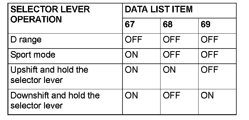STEP 2. Using scan tool MB991958, check data list item 67: Select Switch, item 68: Shift Switch (Up), item 69: Shift Switch (Down).
