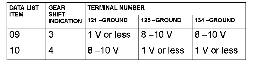 Use scan tool MB991958 to check and see that the combination meter terminal voltage is the same as the voltage shown in the table when the gear speed indication is shown.