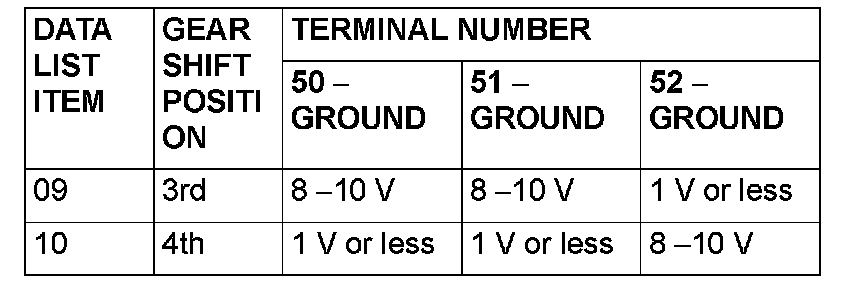 Use scan tool MB991958 to check and see that the PCM terminal voltage is the same as the voltage specified in the table when showing the gear shift indication.