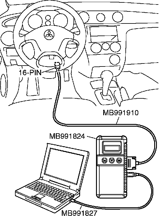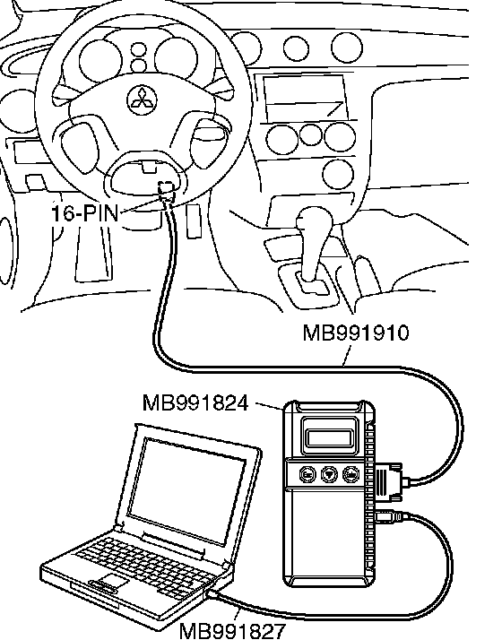 CAUTION: To prevent damage to scan tool MB991958, always turn the ignition switch to the LOCK (OFF) position before connecting or disconnecting scan tool MB991958.