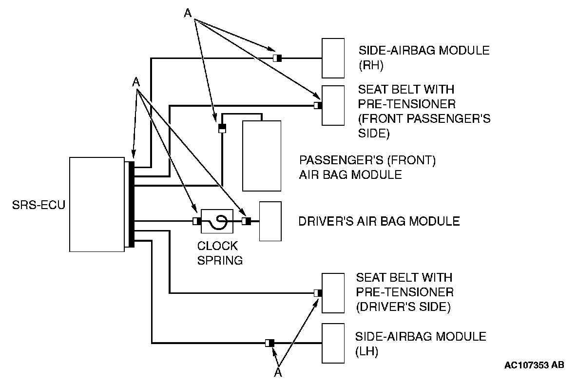 To enhance the system reliability, a connector lock switch is integrated in the SRS-ECU connector, the air bag module connectors, the clock spring connector, the seat belt pretensioner connectors (black connector "A" shown in the illustration).