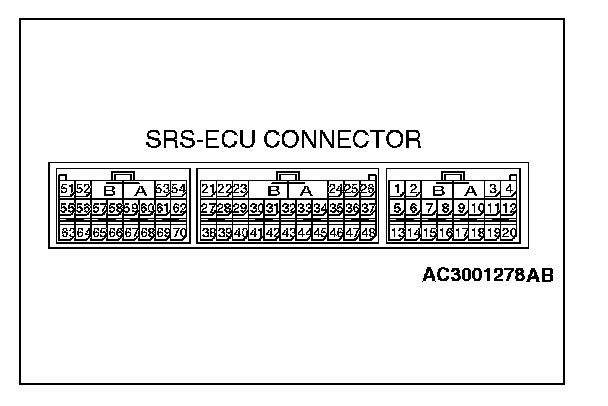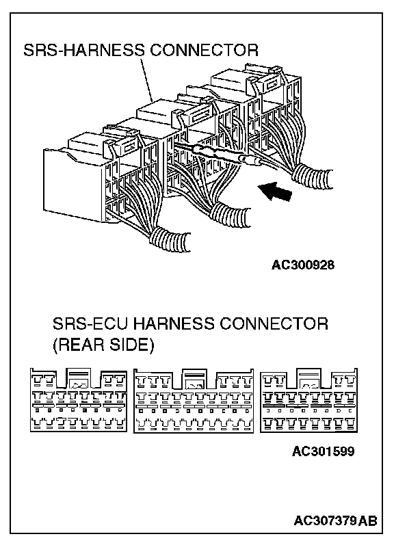 - Inspection of the SRS-ECU connector harness should be carried out by the following procedure. Insert the backprobing tool into connector from harness side (rear side), and connect the tester to backprobing tool. If any tool other than back probing tool is used, it may cause damage to the harness and other components. Furthermore, measurement should not be carried out by touching the backprobing tool directly against the terminals from the front of the connector. The terminals are plated to increase their conductivity, so if they are touched directly by the backprobing tool, the plating may break, which will decrease reliability.