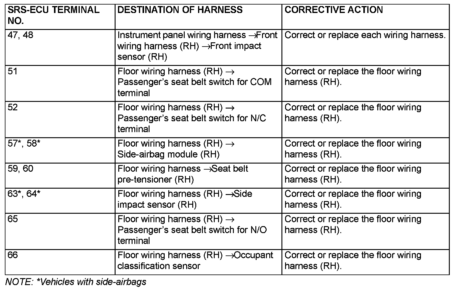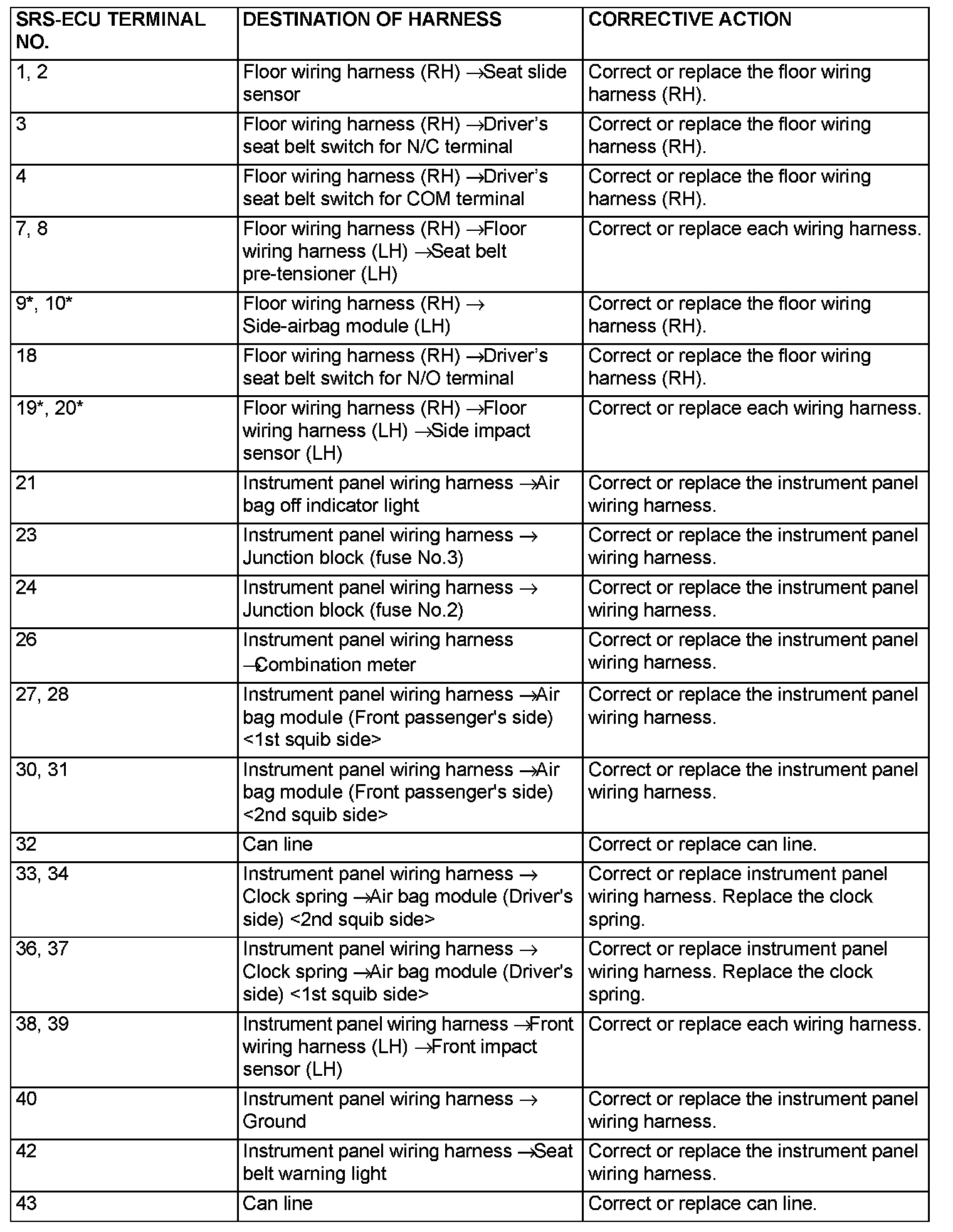 - Do not attempt to repair the wiring harness connectors of the SRS. If any of the connectors are diagnosed as faulty, replace the wiring harness. If the wires are diagnosed as faulty, replace or repair the wiring harness according to the table.