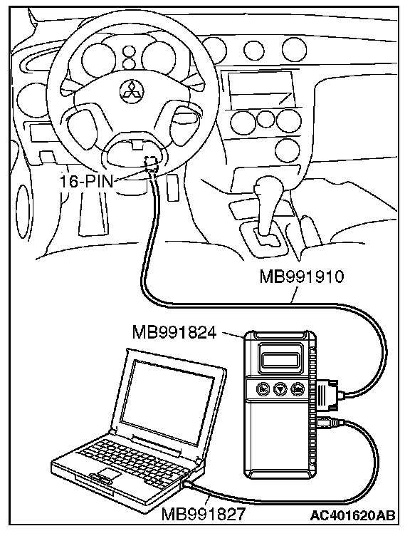 1. Connect scan tool MB991958 to the data link connector (16-pin).