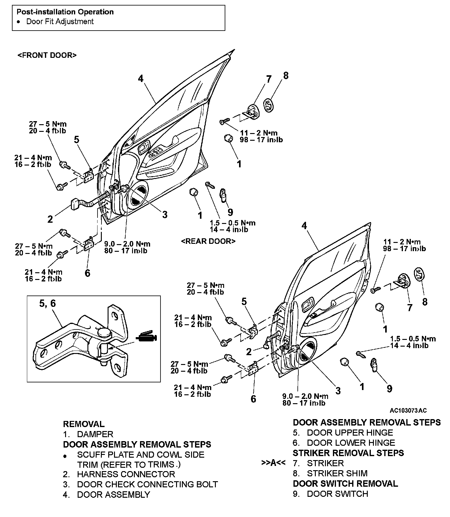 Door check bolt (body side) 9.0 ± 2.0 Nm (80 ± 17 in-lb)