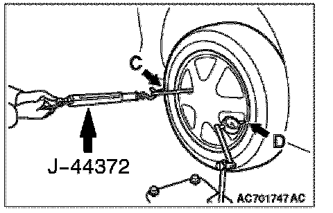 5. Using a spring gauge (special tool J-44372) attached to the wheel spoke with string, pull alternately at position C and D of the wheel rim at points horizontally across the center of the wheel, with a force of 100N (22lb). Read the dial gauge.