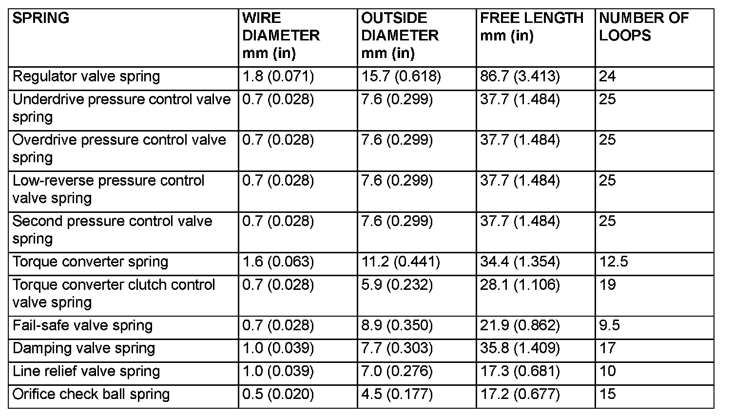 Valve Body Spring Identification Table