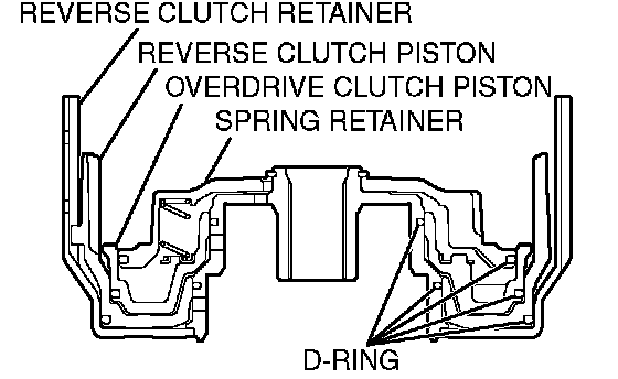 1. Install D-rings in the grooves on the reverse clutch retainer, piston, overdrive clutch piston and spring retainer. Be careful not to twist or damage the D-rings.