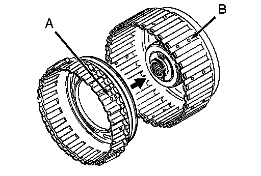 1. Assemble the clutch discs (four pieces) and clutch plates (four pieces), one on top of the other, inside the reverse clutch piston. Assemble both clutch plates so that the places with no teeth (marked A) are aligned with the holes in the retainer (marked B).